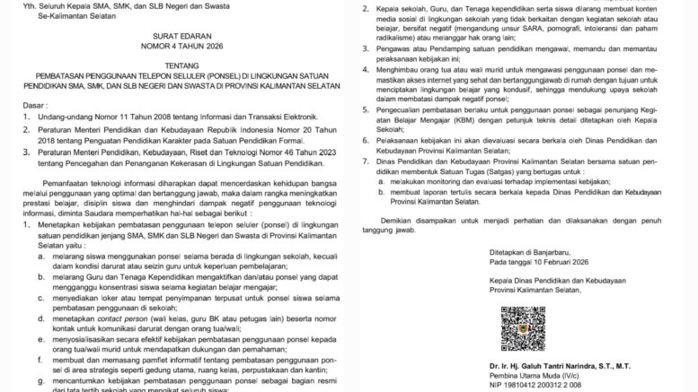 SURAT EDARAN NOMOR 4 TAHUN 2026 TENTANG PEMBATASAN PENGGUNAAN TELEPON SELULER (PONSEL) DI LINGKUNGAN SATUAN PENDIDIKAN SMA, SMK, DAN SLB NEGERI DAN SWASTA DI PROVINSI KALIMANTAN SELATAN